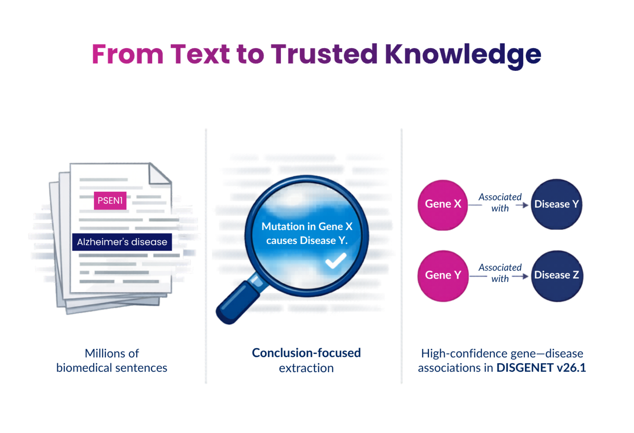 The latest update to DISGENET (v26.1) represents a significant step forward in extracting biomedical knowledge from scientific publications. This release is powered by an enhanced Relation Extraction (RE) model operating within a sophisticated, end-to-end NLP pipeline engineered for precision and scale. This system translates millions of biomedical publications into a structured network of gene/variant–disease relationships, […]