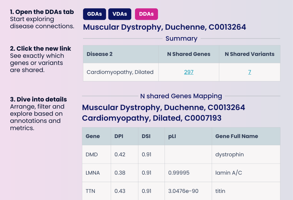 - Interactive Disease-Disease Exploration — don’t just see how many overlapping genes two diseases share, but analyze them in depth thanks to our new interactive Disease-Disease Association (DDA) tables.