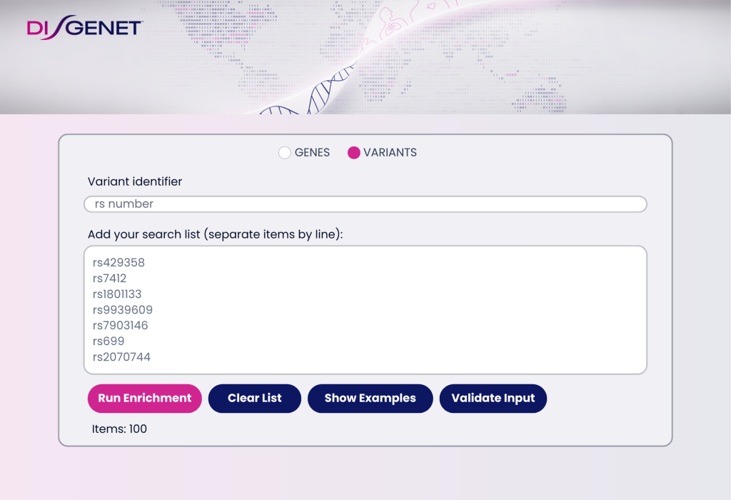 Copy and paste your list and instantly gain insights, connecting experimental hits or patient-derived variants to the rich disease knowledge in DISGENET.