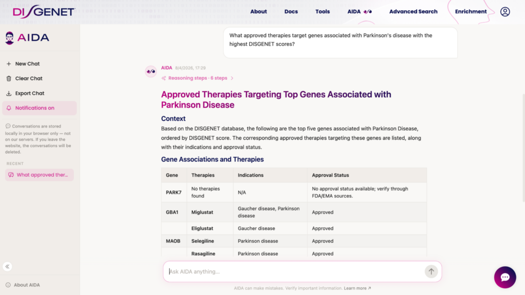 Whether you are running a target landscape assessment, exploring drug repurposing hypotheses, or mapping the evidence landscape for a disease subtype, AIDA provides a natural-language entry point into the DISGENET knowledge graph — grounded in curated, traceable evidence.